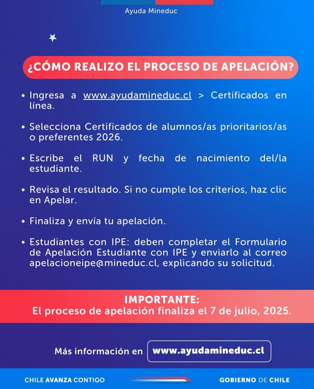 Proceso de Apelación de Alumnos Prioritarios y Preferentes 2026 17/06/2025 Pasos a seguir de como apelar calidad de ALUMNO PRIORITARIO Recordar que los que deben apelar son los ALUMNOS PREFERENTES PLAZO APELACIÓN 7 DE JULIO Anterior Mes del Medioambiente Más recientes ¡Llegaron las vacaciones! También te puede interesar Charla sobre la Ley de Responsabilidad Adolescente 17/06/2025 Día del Libro 03/06/2025 Cupos disponibles para el año escolar 2025 14/03/2025